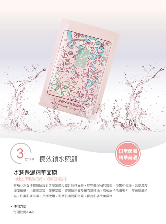 使用方式 CureCare水潤保濕精華面膜 日常保濕精華首選。 每週使用2-3次